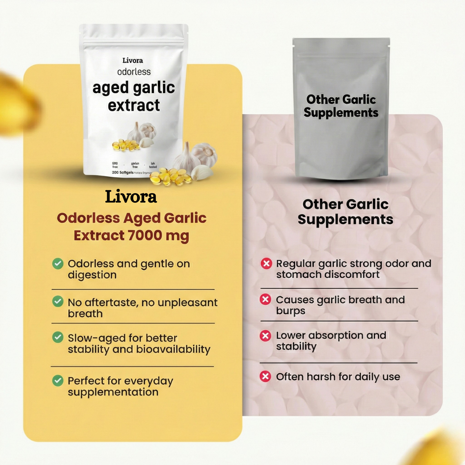 Yes and here’s why Livora is different from everything else you’ve tried. Most “odorless” garlic supplements just slap an enteric coating on regular garlic. That coating usually fails, and you end up burping garlic all day. Our 24-month aging process doesn’t mask the odor it completely eliminates the compounds that cause it. Allicin is converted into S-allyl-cysteine, which absorbs cleanly with zero garlic breath, zero burping, and zero digestive discomfort. Thousands of women take it daily and their families have no idea.